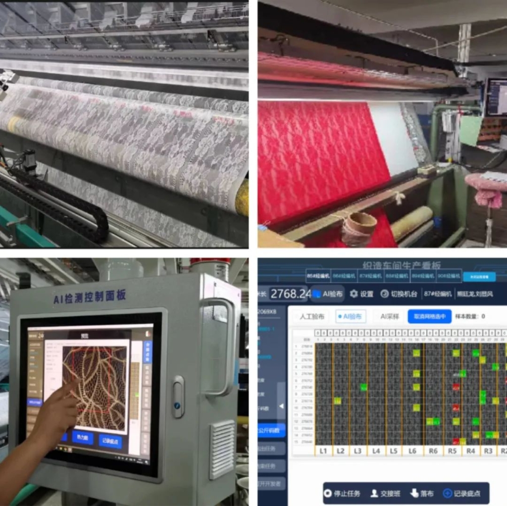 面對(duì)織造企業(yè)人工檢測(cè)招工難、漏檢率高、原料浪費(fèi)多的問(wèn)題,特別是經(jīng)編花邊花型更換頻繁、瑕疵種類(lèi)多、面料具有彈性的檢測(cè)難點(diǎn)問(wèn)題,東龍針紡應(yīng)用AI瑕疵檢測(cè)技術(shù),快速高效檢測(cè)出蕾絲花邊瑕疵,有效提高生產(chǎn)效率。通過(guò)對(duì)生產(chǎn)機(jī)臺(tái)進(jìn)行技術(shù)改造(增加相機(jī)成像及管理系統(tǒng)、圖像采集及預(yù)處理系統(tǒng)),部署5G網(wǎng)絡(luò),開(kāi)發(fā)面料算法、異常識(shí)別等模型,運(yùn)用AI訓(xùn)練等云服務(wù),實(shí)現(xiàn)織造過(guò)程檢測(cè)、坯布瑕疵檢測(cè)、印染布瑕疵檢測(cè)、成品布瑕疵檢測(cè)等。