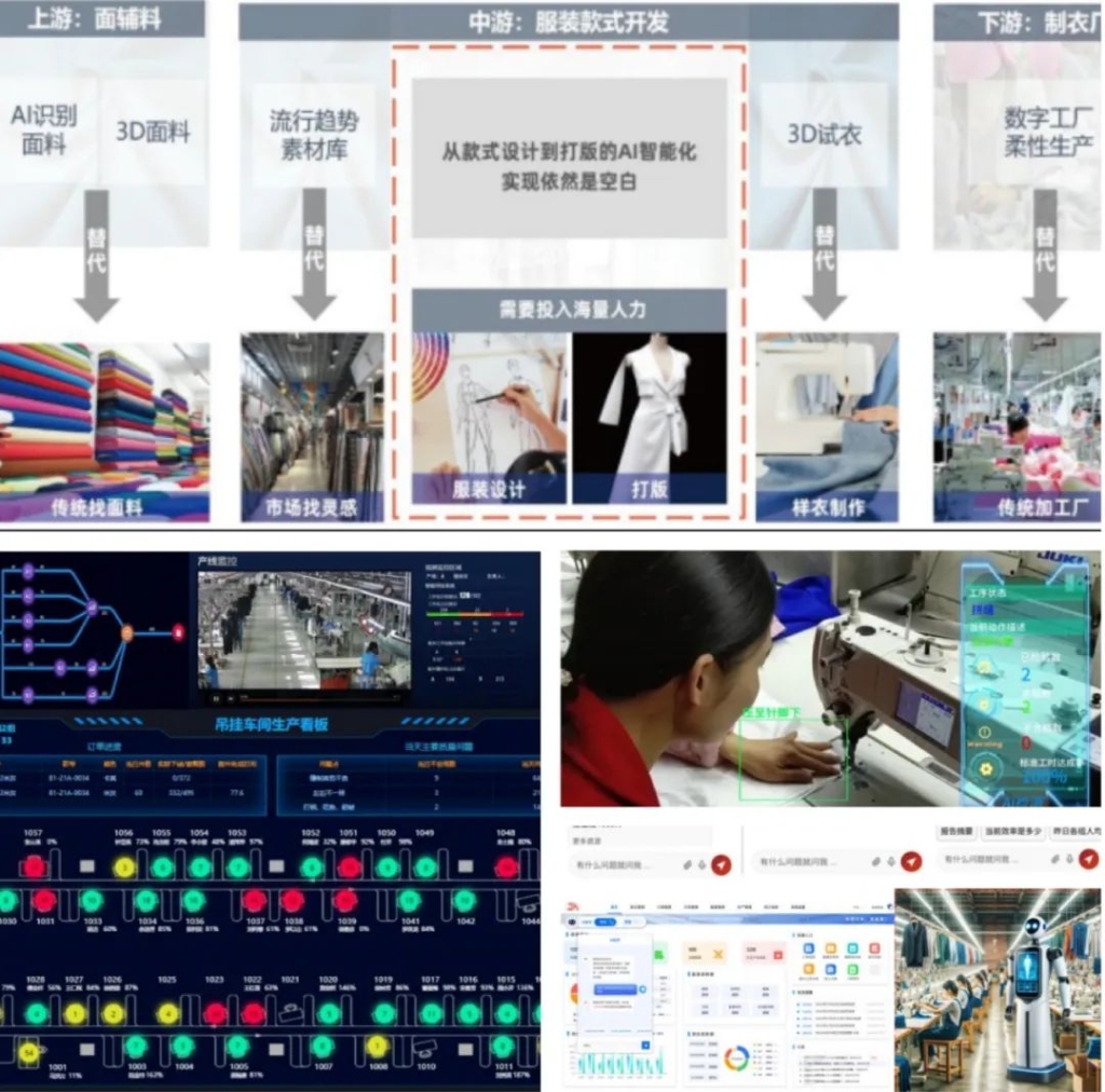服裝行業(yè)作為具有市場(chǎng)化程度高、中小微企業(yè)占比較大、勞動(dòng)密集型等特點(diǎn)的工業(yè)門(mén)類(lèi)之一,近年來(lái)面臨著綜合成本高、市場(chǎng)競(jìng)爭(zhēng)加劇、數(shù)字化智能化轉(zhuǎn)型亟待提升等挑戰(zhàn)。AI技術(shù)正在參與服裝設(shè)計(jì)、生產(chǎn)、供應(yīng)鏈、銷(xiāo)售全流程環(huán)節(jié),大致可以分為數(shù)字人分身、研發(fā)技術(shù)管理、計(jì)劃排產(chǎn)管理、設(shè)備物聯(lián)、智能生產(chǎn)管理、視覺(jué)質(zhì)量檢測(cè)管理決策五個(gè)領(lǐng)域。