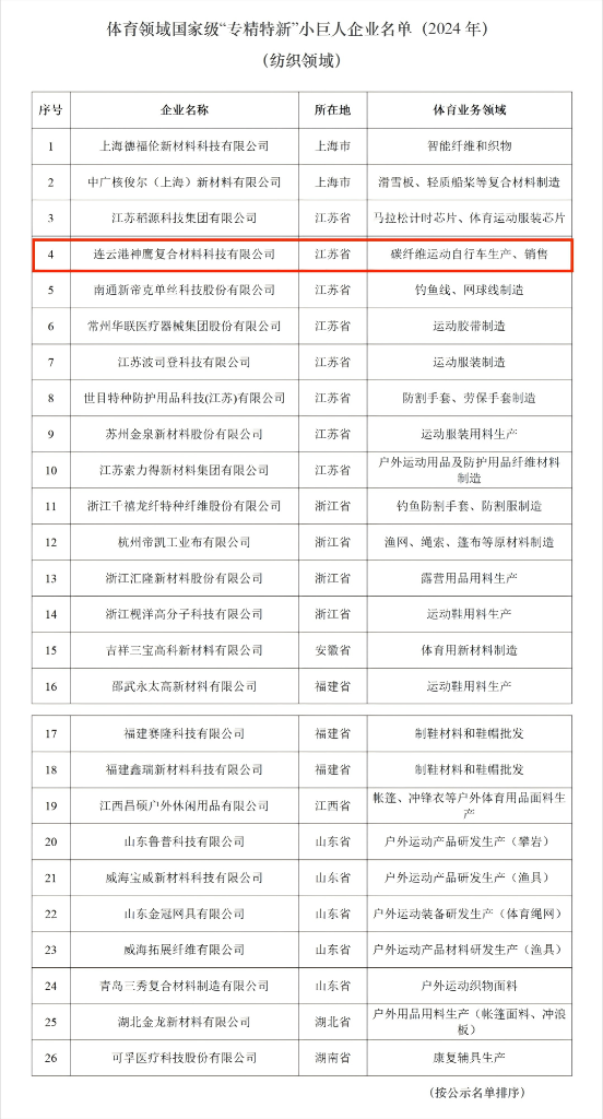 2025年4月3日,體育總局向社會公布體育領(lǐng)域國家級“專精特新”小巨人企業(yè)名單(2024年),鼓勵(lì)和引導(dǎo)體育企業(yè)向?qū)I(yè)化、精細(xì)化、特色化、新穎化方向發(fā)展,激發(fā)體育企業(yè)創(chuàng)新活力和發(fā)展動力。共有146家企業(yè)進(jìn)入體育領(lǐng)域國家級“專精特新”小巨人企業(yè)名單,其中紡織行業(yè)相關(guān)企業(yè)共有26家,具體名單如下: